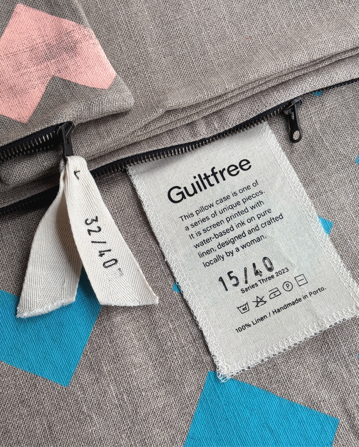 Each textile is hand silkscreened in a studio in Porto using water-based, non-toxic inks. Pieces are individually numbered and then crafted into pillows in a small textile workshop in northern Portugal, while all other components are sourced as locally as possible.